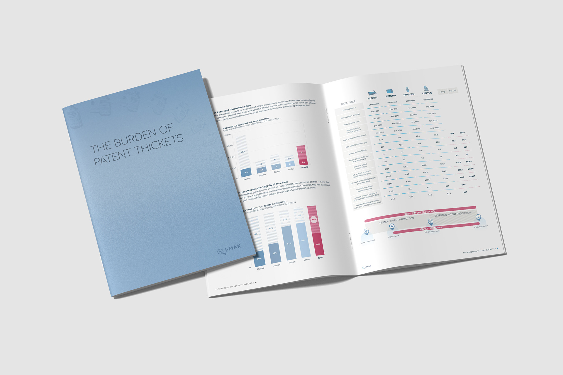 The Initiative for Medicines, Access, & Knowledge (I-MAK) is an organization focused on building a more equitable medicines system. I developed the visual concepts and led design for a long-form report, The Burden of Patent Thickets, and its corresponding visuals for a social campaign. Deliverables included infographics, data visualizations, and the final report layout.