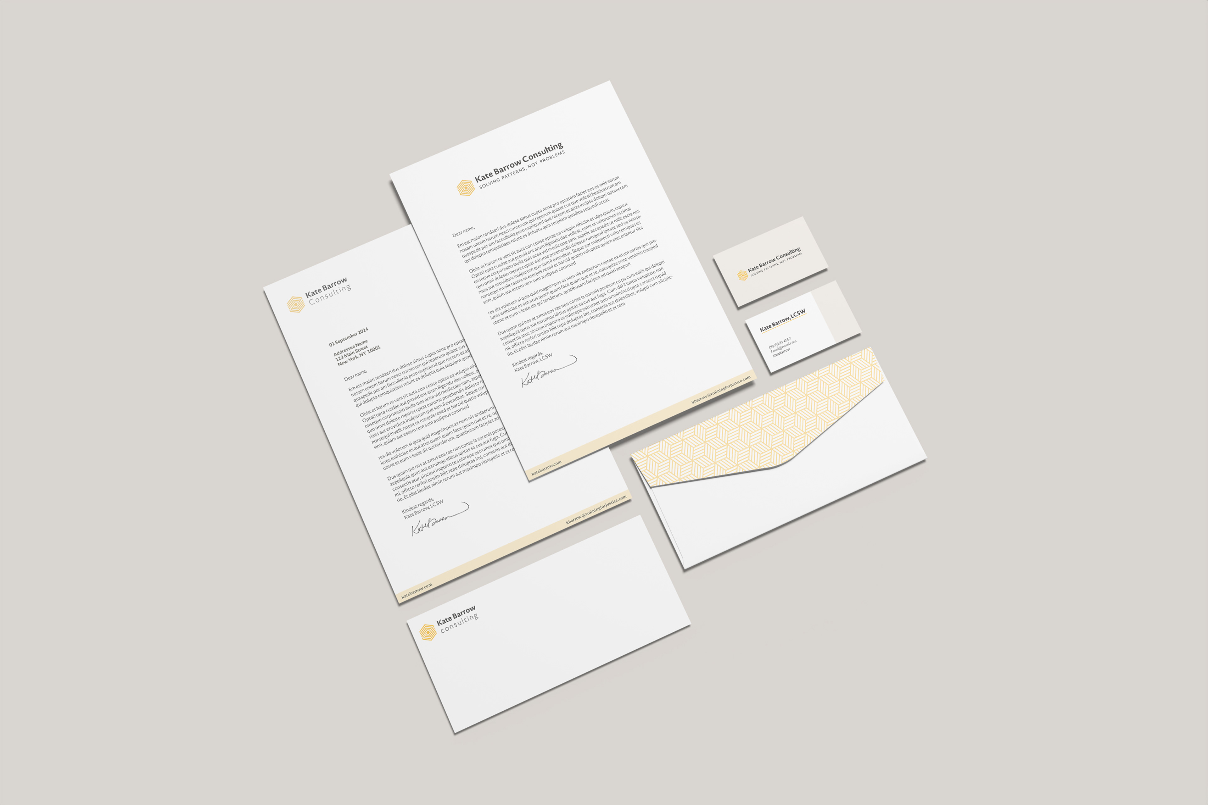 The winning concept for Kate's logo was a hexagonal mark in a rich, goldenrod yellow. Reminiscent of a honeycomb, the brandmark references a meaningful metaphor within Kate’s work: for their intricate honeycomb structures to thrive, honey bees manifest the ultimate display of cooperation and inclusivity. Through Kate's trainings, workshops, and organizational consulting, she support clinical leaders in doing the same—navigating complex systems through an inclusive lens.